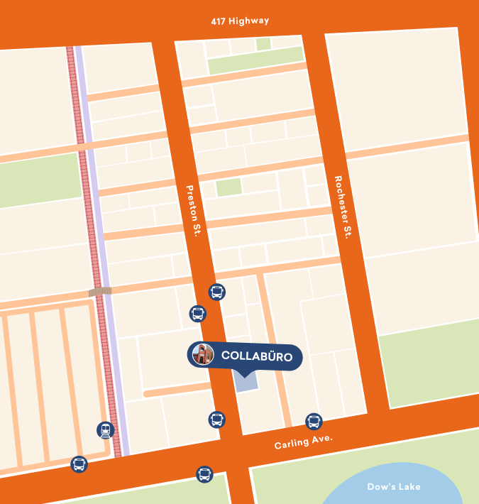 - Dow's Lake station: get off the station and walk east on Carling Ave, cross Preston Street and Collaburo besides the tall Claridge Icon building (2 mins walk)